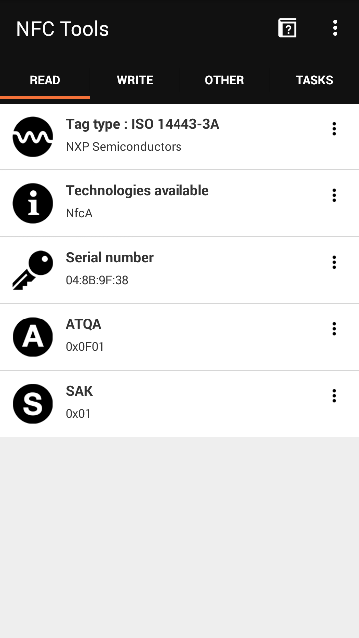 We also see the serial number for the tag, also called the UID, and the ATQA and SAK, which help identify the type of tag it is.