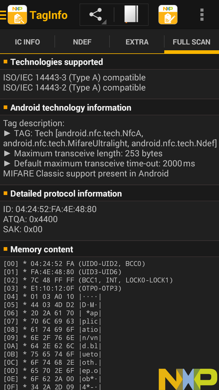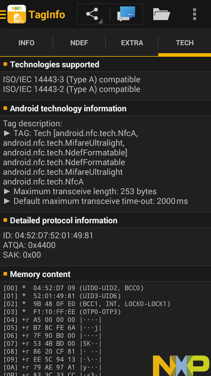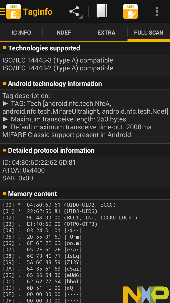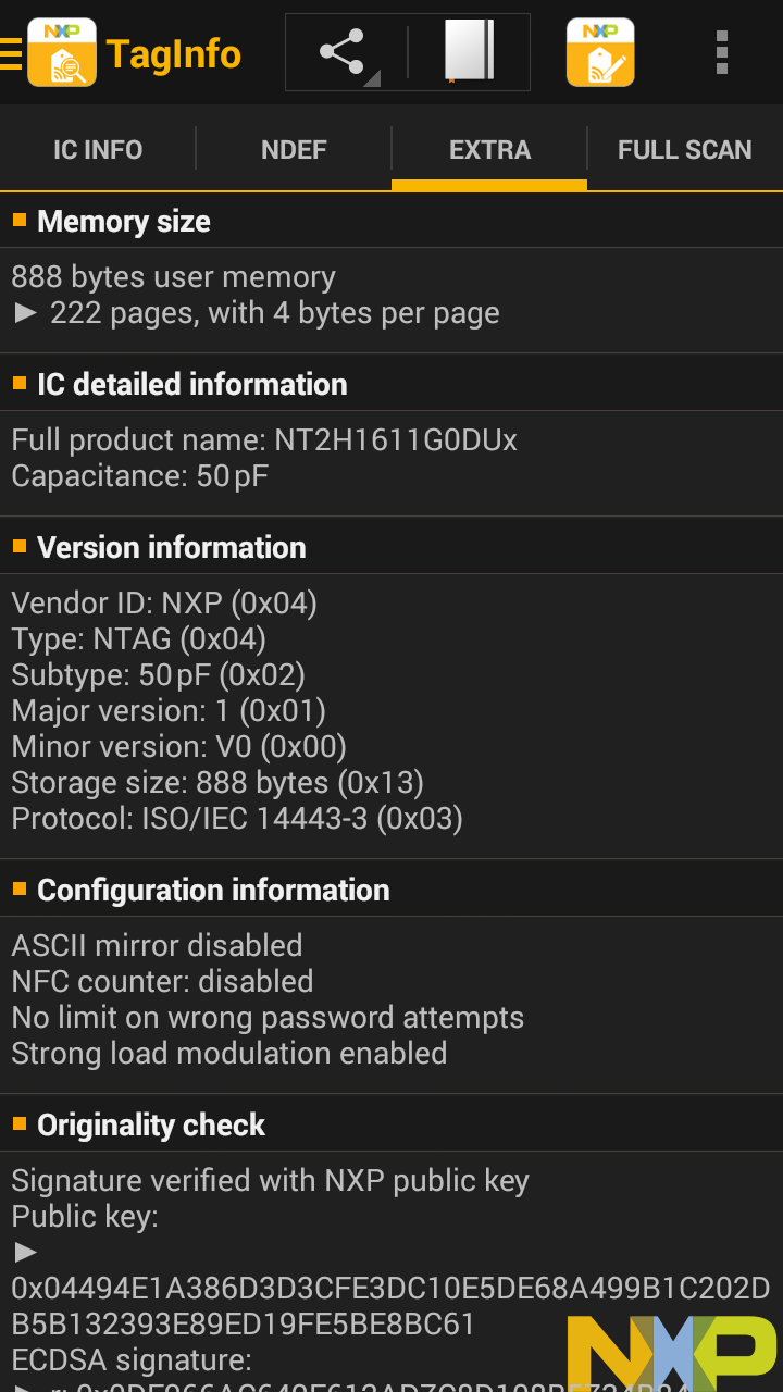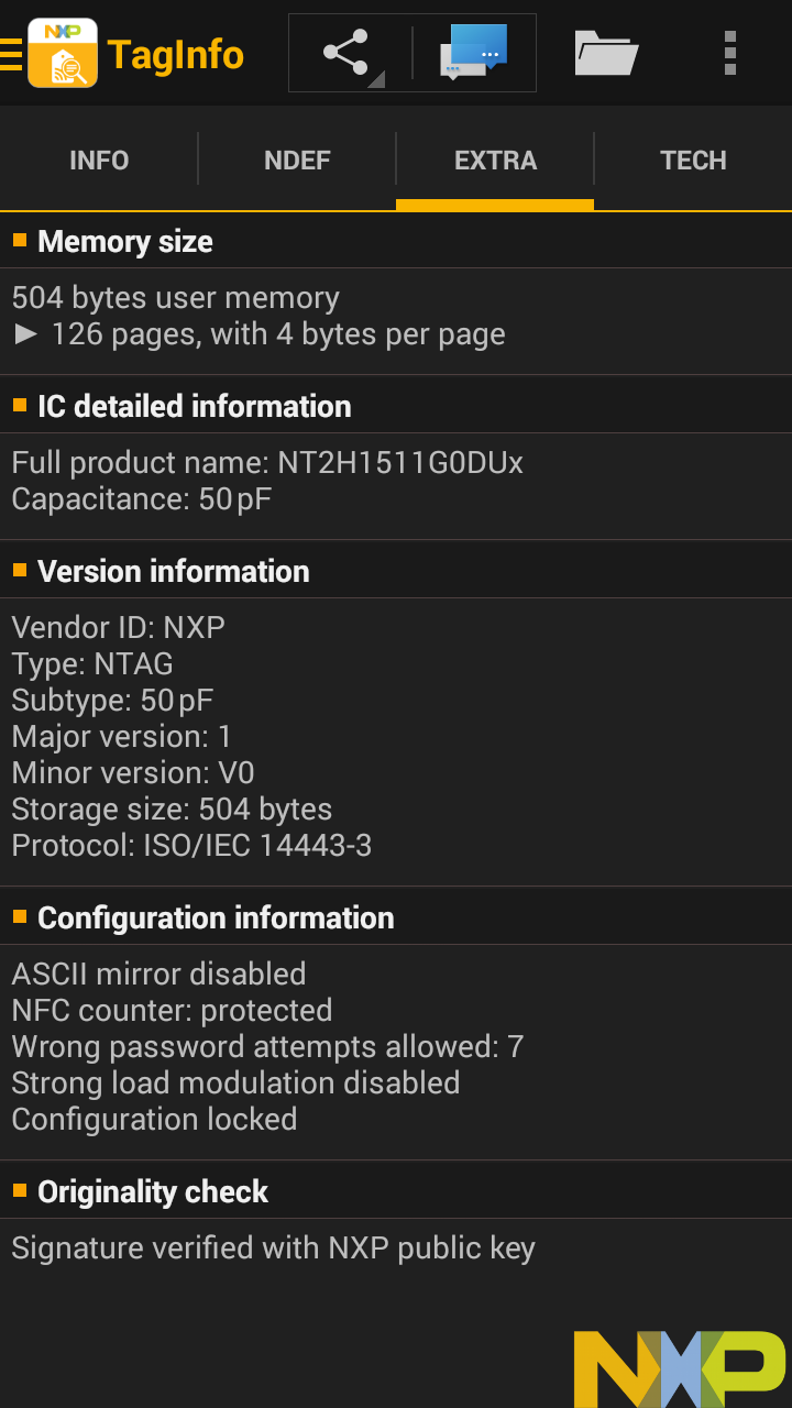 Since it's an NXP tag, let's see if NXP's own app, NXP TagInfo, can tell us anything more.