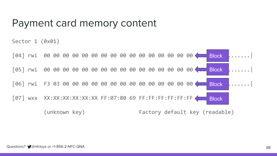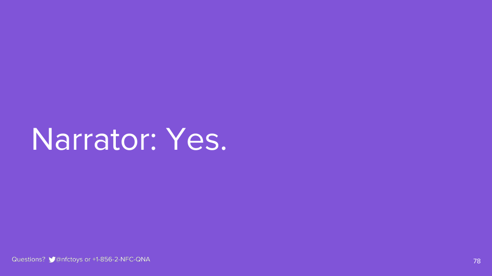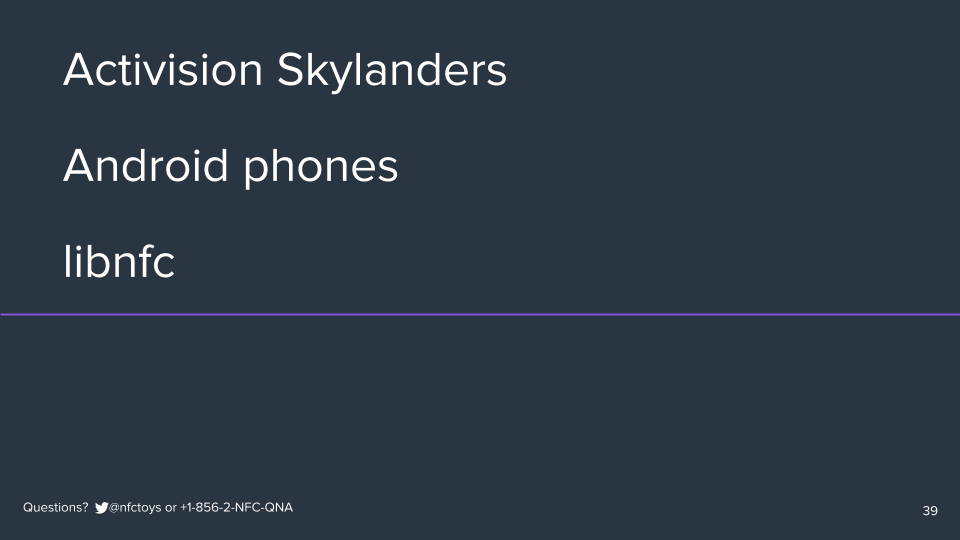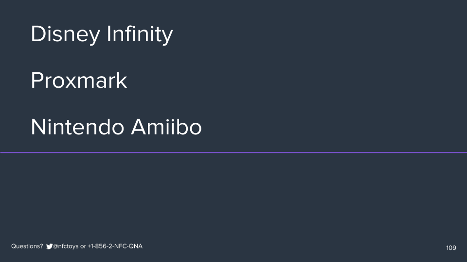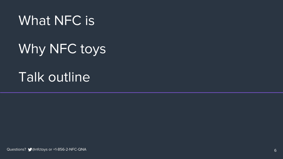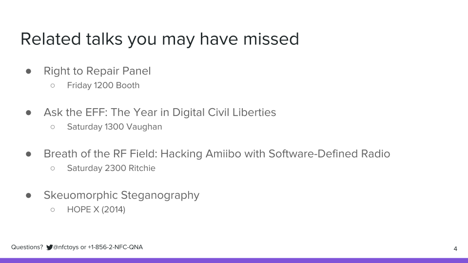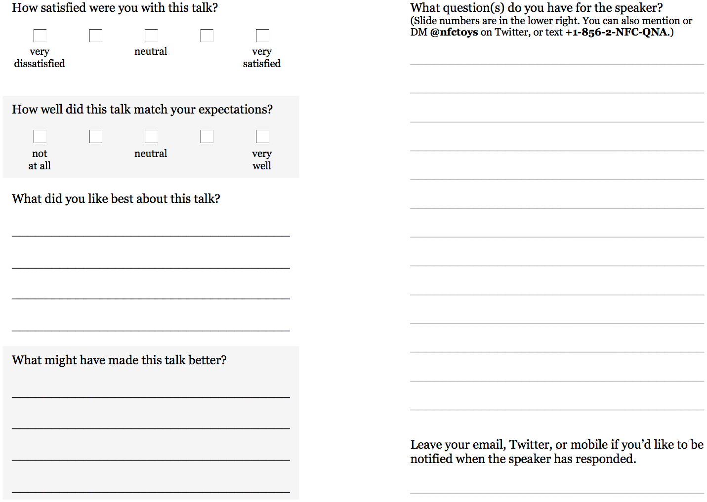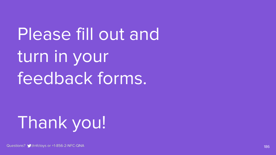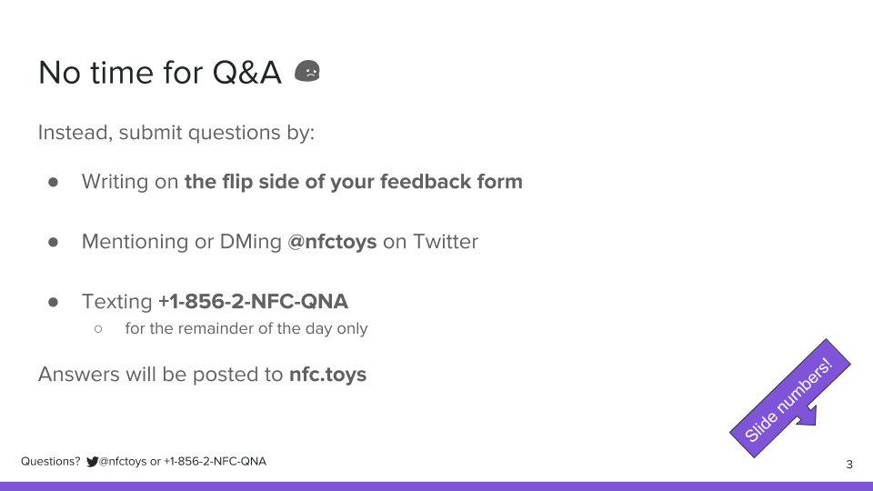 We're covering a lot in this talk, and it clocks in at just under fifty minutes, which means we don't have time for live Q&A. But, Q&A is important, so I will be taking questions on paper and electronically. The in-person audience can write their questions on the flip side of their feedback form. Both the in-person and livestream audiences can submit questions via Twitter to @nfctoys, or via text message for the remainder of the day only to +1-856-2-NFC-QNA. There are slide numbers on each slide you can reference. I will post answers to questions on nfc.toys, and reply to you with a link to your answer. If you're watching this talk in the future, asking questions via Twitter will be your best bet for a response.