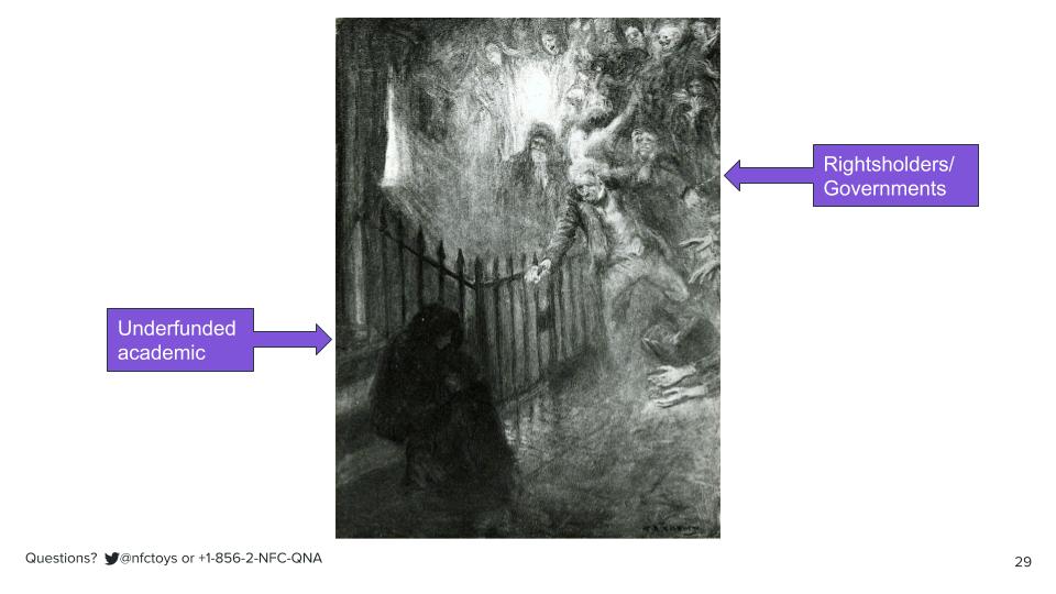 So, who believes that obtaining credentials for an NFC toy is legal, and wants to assert their right to do so? Raise your hands.