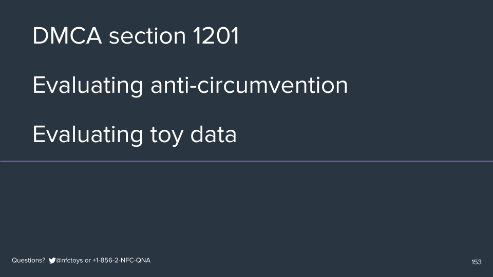 Finally, we talked about the legal implications of doing so, and I have hopefully established that using NFC toys for your own data storage is probably not circumventing an effective access control, is probably not a copyright infringement, and that this work is legally enabling new interoperability of NFC toys with your own hardware.